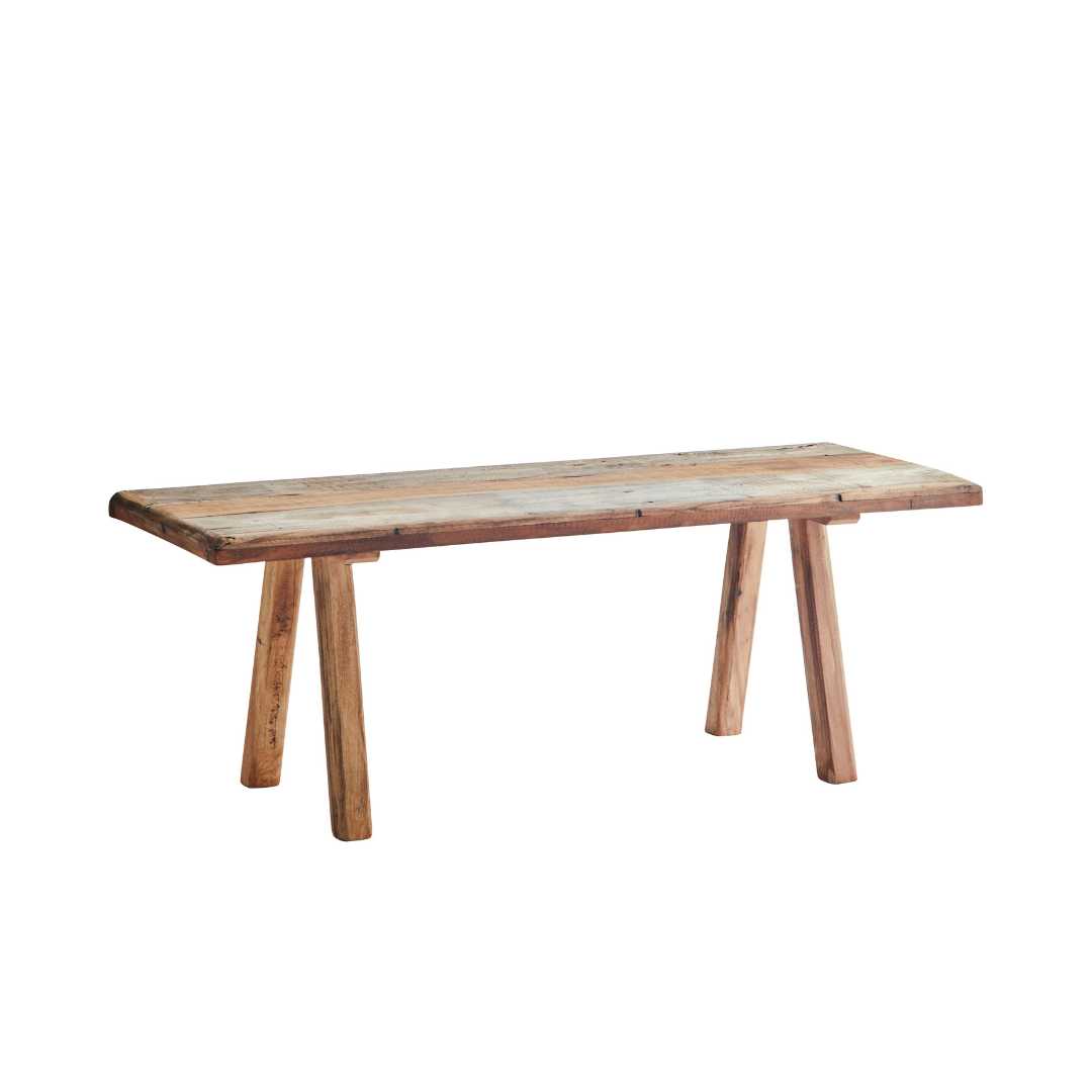 Diese recycelte Holzbank ist nicht nur praktisch, sondern auch umweltfreundlich. Sie ist aus wiederverwertetem Holz gefertigt und passt mit ihrer natürlichen Farbe leicht in verschiedene Einrichtungsstile. Da jede Bank von Hand gemacht wird, sind kleine Unterschiede in Form und Farbe normal – jede Bank ist ein Unikat.